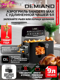 DEMIAND SANDERS MAX aerogrilli (model: DK-2400) — 9 litr sig‘imi bilan oilaviy ovqatlar uchun juda qulay. 2200W quvvat tez qiziydi va ovqatni bir maromda pishiradi. 12 ta tayyor dastur esa kartoshka fri, tovuq, baliq, sabzavot va boshqa taomlarni oson pishirishga yordam beradi.